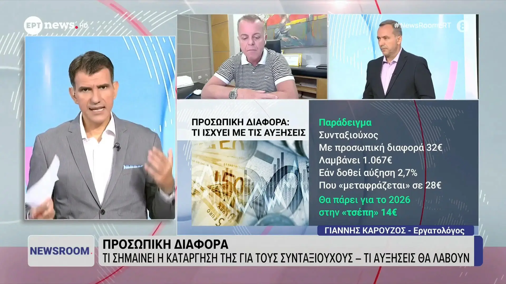 Ο Δικηγόρος Εργατολόγος Γιάννης Καρούζος καλεσμένος στην ΕΡΤ NEWS για τις αυξήσεις στα μισθολόγια των σωμάτων ασφαλείας και των ενόπλων δυνάμεων, καθώς και για την κατάργηση της Προσωπικής Διαφοράς Συνταξιούχων-Αποστράτων