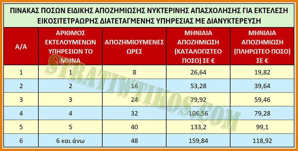 Μετά την έκδοση της ΚΥΑ (ΦΕΚ Β’ 5175/30-9-2025) (ΔΕΙΤΕ ΕΔΩ) για την αύξηση των ωρών που αποζημιώνονται κατά τη νυχτερινή εργασία, με έγγραφο της ΔΟΙ/ΓΕΣ, επανακαθορίζεται από 1 Ιαν 2026 η καταβολή της ειδικής αποζημίωσης μετά από εκτέλεση 24ωρης υπηρεσίας με διανυκτέρευση, δηλ. 3,33€ μεικτά ανά ώρα (για 8ωρο: από 22:00 έως 06:00).