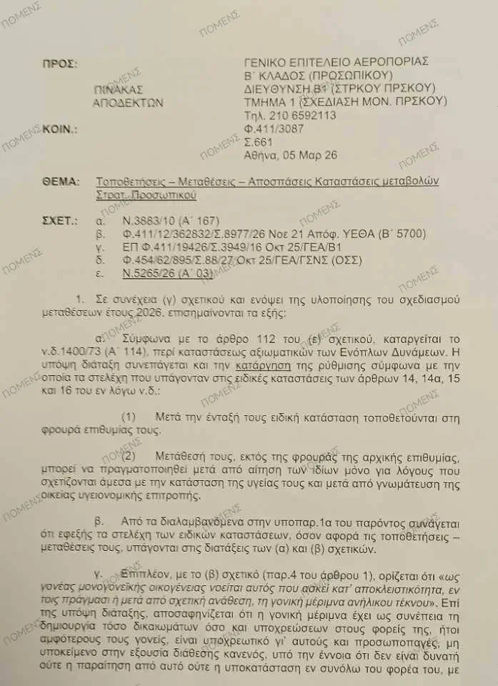 Σύμφωνα με έγγραφο του ΓΕΑ (Β1), με ημερομηνία 5 Μαρτίου 2026, που δημοσιοποίησε η ΠΟΜΕΝΣ, δίνονται διευκρινίσεις για τον σχεδιασμό μεταθέσεων του 2026 και συγκεκριμένα επισημαίνονται οι ισχύουσες διατάξεις που αφορούν τις μεταβολές προσωπικού ειδικών καταστάσεων.